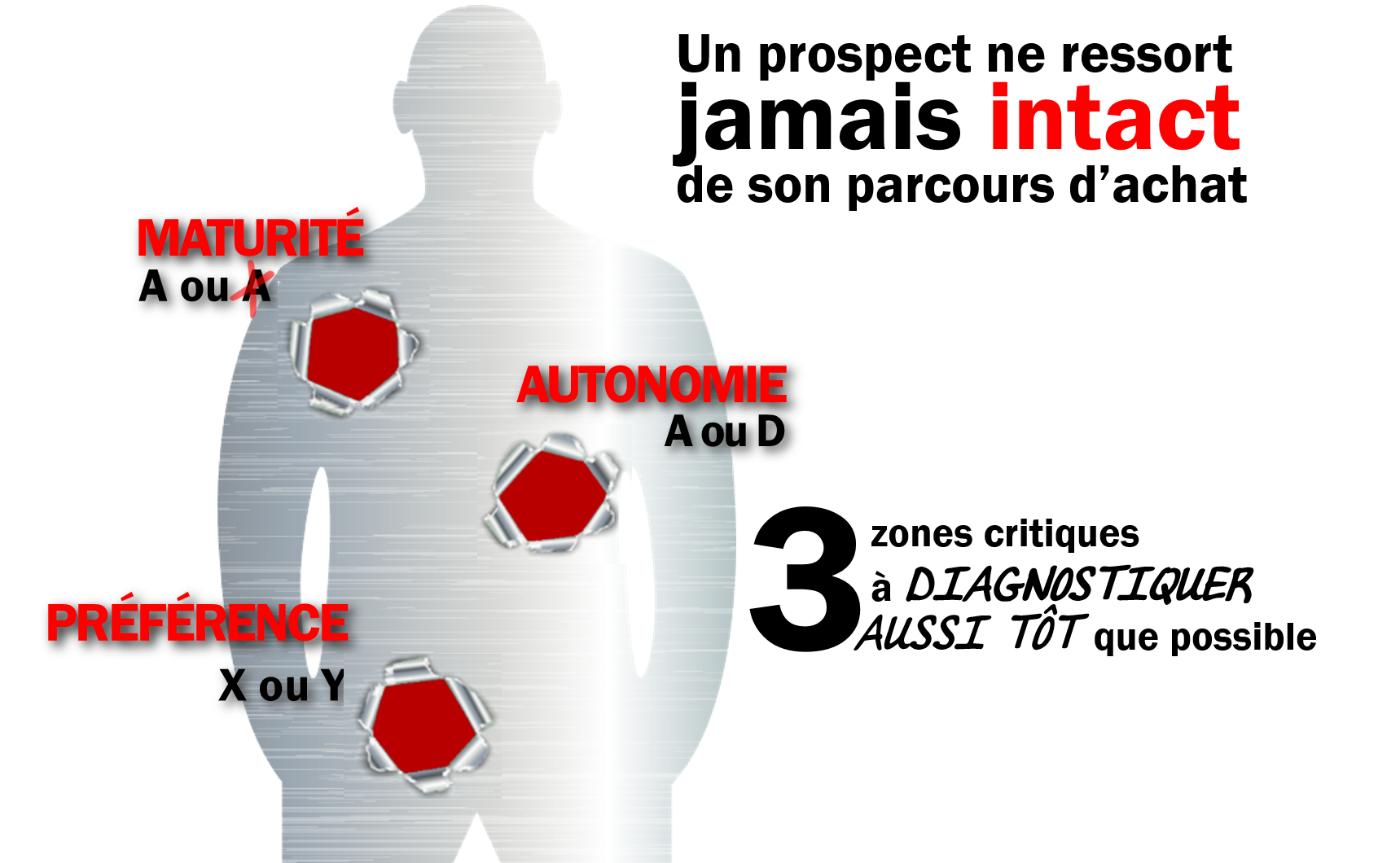 Imaginez le prospect autonome qui préfère la solution concurrente : « il sait ce qu’il veut et ce n’est pas chez vous qu’il va l’acheter » ! Rien que la probabilité qu’il laisse le vendeur aligner 10 questions relève du fantasme pur. Et l’on voit ici le décalage qui s’est créé entre les méthodes de vente basées sur la découverte des besoins qui sont enseignées depuis les années 1960, et la réalité terrain du monde moderne : le vendeur ne peut commencer par cette découverte classique, la découverte des besoins est compromise, et il le traduit souvent par « on est arrivé trop tard, c’était déjà perdu ». Les ressorts pour ne pas perdre dans ce cas sont très spécifiques et passent par la remise en cause du système de pensée du prospect : identifier une faille dans son raisonnement, et le faire avec suffisamment de charisme pour qu’il laisse le vendeur opérer.
